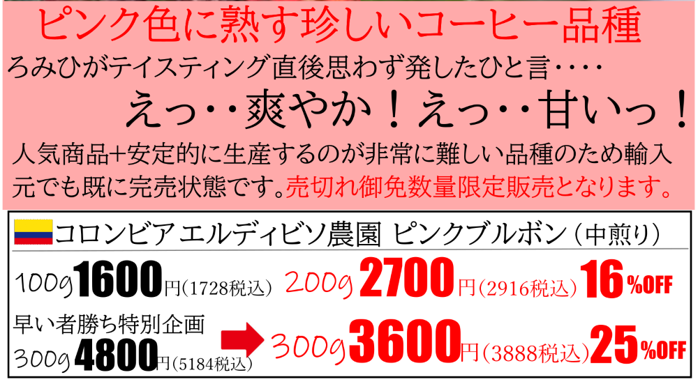 **「コロンビア エルディビソ農園 ピンクブルボン」**前倒しで販売を開始します。